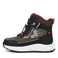 Практичные черные ботинки для мальчика с динамичным дизайнерским рисунком. Верх сочетает современную искусственную кожу и плотный непромокаемый текстиль. Шерстяная подкладка и войлочная стелька обеспечивают комфорт стоп в любую погоду. Высокая контрастная подошва из материала ТЭП отличается легкостью, морозостойкостью и хорошим сцеплением с любой поверхностью. Модель фиксируется удобной застежкой на липучку.