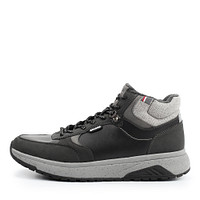 Высокие демисезонные кроссовки для активных мужчин. Модель выдержана в темно-синем цвете с серыми вставками, подошва – светлая. Выполнена обувь из искусственной кожи, в верхней части голенища – трикотажные вставки, по бокам – текстильные элементы с водоотталкивающей пропиткой. Модель на шнуровке, на ровной подошве.