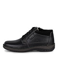 Черные мужские ботинки с комбинированным верхом из гладкой натуральной и искусственной кожи. За комфорт стоп отвечают подкладка и стелька из мягкой натуральной шерсти. Изогнутая подошва из полиуретана обеспечивает оптимальную поддержку стоп и отличается прочностью. Утолщенный ворот бережно поддерживает щиколотки.