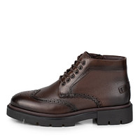 Классические темно-коричневые высокие ботинки с декоративным брогированием. Верх выполнен из натуральной кожи с разной фактурой: зернистой и гладкой. Подкладка и стелька утеплены мягкой овечьей шерстью для поддержания оптимального микроклимата обуви на улице и в помещении. Широкая подошва из материала ТЭП с высоким протектором улучшает сцепление с любой поверхностью.
