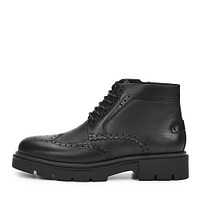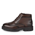 Команда бренда, создавая темно-коричневые высокие ботинки, украсила модель характерными для брогов перфорированными узорами. Для пошива обуви использовали кожу с разной фактурой: зернистой и гладкой. Пару в готовом виде окрасили несколько раз, чтобы добиться особой глубины оттенка. Внутри обувь утеплили мягкой овчиной. Широкая подошва с высоким протектором позволяет сохранить тепло и  улучшает сцепление с любой поверхностью.