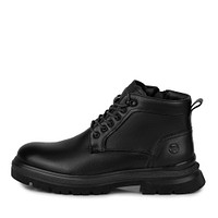 Мужские зимние ботинки выполнены из крупнозернистой плотной темно-коричневой кожи, отполированной до блеска. Подкладка и съемная мягкая стелька из густой шерсти, благодаря которой ноги не будут мерзнуть даже во время долгих прогулок. Широкая подошва с высоким протектором и небольшим наплывом на задник создает отличное сцепление с заснеженной дорогой.  Для удобства использования кожаная петля на заднике и дополнительная боковая молния.