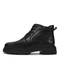 Практичные коричневые ботинки на шнуровке. Верх выполнен из зернистой натуральной кожи. Утолщенный ворот бережно поддерживает зону щиколоток. Пара утеплена мягкой шерстью для оптимальной терморегуляции на улице и в помещении. Высокая резиновая подошва с выраженными протекторами остается устойчивой даже на скользкой поверхности. Модель удобно застегивается на молнию.