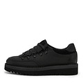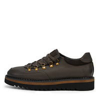 Демисезонные полуботинки чёрного цвета с внутренней отделкой из кожи шевро выполнили из комбинации натуральной кожи 85% и спилка 15%. Полуботинки с усиленными петлями шнуровки установили на рифленую подошву из ЭВА материала. Пару декорировали патчем с логотипом на язычке и логотипом-оттиском на заднике.