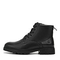 Мужские ботинки чёрного цвета изготовили из натуральной кожи. Пару декорировали оттисками логотипа на язычке и заднике. Модель с усиленной шнуровкой, боковой молнией и брендированной петлей. Подкладка из натурального меха создает ощущение тепла и уюта, защищая ноги от мороза. Подошва из резины гарантирует надежное сцепление с различными поверхностями и долговечность изделия
