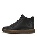 Высокие кеды с боковой молнией выполнили из кожи из спилка. Цвет пары - чёрный. Натуральная шерсть — идеальный материал подкладки для зимней обуви, защищающей от холода и влаги. Резиновая подошва высотой 35 мм сочетает амортизацию и защиту.