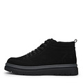 Базовые черные ботинки. Верх выполнен из натурального нубука с бархатистой текстурой. Подкладка и стелька утеплены натуральной шерстью и поддерживают комфортную температуру внутри обуви. Высокая резиновая подошва с выраженными протекторами отличается прочностью и хорошим сцеплением с поверхностью. Модель фиксируется шнурками и удобно застегивается на молнию.