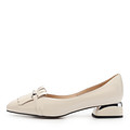 Базовые кожаные туфли бежевого цвета. Подкладка выполнена из мягкой натуральной кожи, стелька — из шевро. Устойчивый квадратный каблук и удобная колодка обеспечивают правильное распределение нагрузки и хорошую поддержку стопы. Модель дополнена лаконичным декором в носочной части пары.