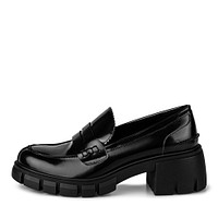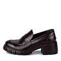 Оригинальные темно-коричневые женские туфли, которые сочетают элегантность, стильный вид и комфорт. Верх обуви сделан из кожи, стилизован под пенни-лоферы с небольшой пряжкой и язычком с фигурным краем. Подошва и каблук – массивные, с тракторным рисунком протектора. Каблук широкий, квадратной формы.
