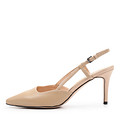 Элегантные кожаные туфли станут прекрасным дополнением к вашему гардеробу и идеально подойдут для создания образов в разных стилях. Трендовая модель «слингбэк» с открытой пяткой выполнена в нежном бежевом цвете. Подкладка из натуральной кожи и стелька из шевро обеспечивают комфорт стоп. Тонкий каблук высотой 77 мм визуально делает силуэт изящнее.