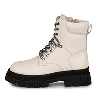 Черные женские ботинки из зимней коллекции идеально подойдут под любой пуховик, пальто или шубу. Пара выполнена из натуральной кожи оттенка слоновой кости в сочетании с черной широкой подошвой и черно-белыми шнурками. Крупный мягкий кант создаст ощущение дополнительного комфорта при использовании.