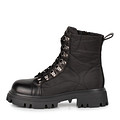Акцентные черные ботинки в стиле хайкеров с комбинированным верхом из текстиля и кожи. Оптимальную защиту от холода обеспечивают войлок на подкладке и стельке, а также высокая рифленая подошва из резины. Прочная шнуровка надежно фиксирует пару на ноге, а практичная молния ускоряет процесс фиксации обуви. Микс фактур (стеганая текстильная и гладкая кожаная) добавляют паре характера.