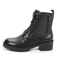 Высокие кожаные ботинки бордового цвета. Модель утеплена ворсином. Ботинки застегиваются на молнию, ширину можно регулировать шнуровкой. Резиновая подошва с глубоким рисунком протектора гарантирует хорошее сцепление с поверхностями.