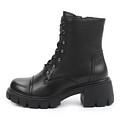 Модельные женские ботильоны для весны или осени. Выполнены из натуральной кожи, подкладка – ворсин. Пара лаконичная, сдержанного черного цвета. Подошва и шнуровка – в тон верху обуви. Голенище на шнуровке с заклепками, которые придают модели нотку брутальности. Каблук и подошва – с «тракторным» рисунком протектора, очень массивные.