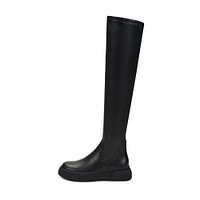 Эффектные черные ботфорты с бархатистой текстурой. Комбинированный верх сочетает плотный текстиль и спилок. Пара утеплена мягким ворсином. Высокая подошва из материала ТЭП отличается износостойкостью и хорошим сцеплением с поверхностью.