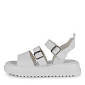 Базовые кожаные белые сандалии с трендовыми широкими ремешками. Утолщенная подошва из полиуретана гарантирует оптимальную поддержку. Пара отлично впишется в образы с брючными костюмами, воздушными платьями и юбками.