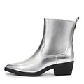 Актуальные серебряные казаки в ковбойском стиле. Верх казаков выполнен из кожи из спилка. Подкладка и стелька утеплены мягким ворсином. Утолщенная резиновая подошва отличается прочностью. Характерный скошенный каблук высотой 5,5 см грамотно распределяет нагрузку на стопы.