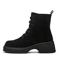 Лаконичные черные ботинки с высокой шнуровкой. Верх выполнен из бархатистого спилка. Подкладка и стелька утеплены натуральной шерстью. Утолщенная подошва из материала ТЭП обеспечивает устойчивость на любых поверхностях.