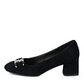Элегантные черные туфли сделаны из текстиля, имитирующего замшу. Он не нуждается в трудоемком уходе и будет хорошо смотреться в любую погоду. Туфли на устойчивом каблуке высотой 50 мм украшены крупной пряжкой — ее четкие геометрические линии красиво выделяются на темном фоне. Модель можно носить на работу, подойдут туфли и для более торжественных выходов.