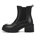 Архитектурные черные ботильоны. Верх выполнен из кожи из спилка. Подкладка и стелька утеплены мягким ворсином. Пара удобно фиксируется молнией. Утолщенная подошва из материала ТЭП отличается хорошим сцеплением с поверхностью. Блочный каблук высотой 7 см устойчив и грамотно распределяет нагрузку на стопы.