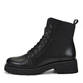 Минималистичные черные ботинки с высокой шнуровкой. Материал верха - кожа из спилка. Подкладка и стелька утеплены мягким ворсином. Утолщенная ребристая подошва из материала ТЭП обеспечивает устойчивость на любой поверхности.