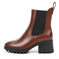Лаконичные женские челси на весну, осень. Пара стилизована под челси: у нее нет застежек, в верхней части голенища – широкие эластичные резинки, фиксирующие модель. Обувь выполнена из спилка, стелька и подкладка – из ворсина. Челси на небольшом квадратном каблуке. Подошва тонкая, с оригинальным глубоким протекторным рисунком.