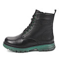 Оригинальные зимние ботинки для ярких, неординарных женщин. Модель выполнена из кожи черного цвета. Дизайн обуви лаконичный, без лишнего декора. Яркий акцент этой пары – контрастная плотная подошва с монолитным каблуком и протекторным рисунком, шнуровка. Эти элементы зеленые, что делает обувь креативной.