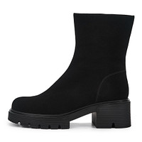 Минималистичные черные ботильоны. Верх выполнен из мелкозернистой натуральной кожи. Подкладка и стелька утеплены мягкой шерстью для оптимальной терморегуляции на улице и в помещении. Высокая подошва из материала ТЭП с выраженными протекторами отличается легкостью, морозоустойчивостью и хорошим сцеплением с любой поверхностью. Широкий каблук высотой 6,5 см грамотно распределяет нагрузку на стопы.