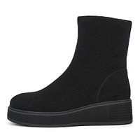 Минималистичные черные ботинки на холодный сезон. Материал верха - мелкозернистая натуральной кожа. Пара утеплена мягкой шерстью для оптимальной терморегуляции на улице и в помещении. Высокая платформа из ТЭП отличается легкостью, морозоустойчивостью и хорошим сцеплением с любой поверхностью.