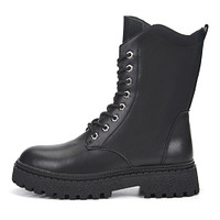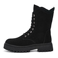 Стильные черные ботинки с архитектурным оформлением голенища. Верх выполнен из бархатистого спилка. Шерстяная стелька обеспечивает комфортную терморегуляцию на улице и в помещении. Высокая резиновая подошва с выраженными протекторами отличается прочностью и хорошим сцеплением с любой поверхностью. Модель со шнуровкой и удобной застежкой на молнию.