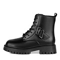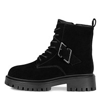 Стильные черные ботинки на платформе. Кожаный верх декорирован ремешком и эффектной пряжкой. Подкладка и стелька утеплены мягкой натуральной шерстью для оптимальной терморегуляции внутри обуви. Высокая резиновая подошва с выраженными протекторами обеспечивает надежное сцепление с любой поверхностью. Модель с высокой шнуровкой и удобной застежкой на молнию.