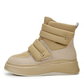 Футуристичные бежевые ботинки в стиле мунбутов. Верх комбинирует фактуры современных аналогов нубука и кожи. Шерстяные подкладка и стелька поддерживают оптимальную температуру внутри пары. Высокая подошва из материала ТЭП отличается легкостью, морозоустойчивостью и хорошим сцеплением с поверхностью. Модель с застежкой велькро и удобной молнией.