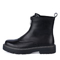Лаконичные демисезонные ботинки черного цвета – модель, которая хорошо смотрится с джинсами или плотными колготками, брюками. Пара декорирована контрастной белой строчкой на подошве, которая придает обуви динамичный вид, спортивные нотки. Застежка – молния, расположенная спереди. Подошва ровная, с небольшим каблуком.