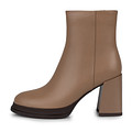 Эффектные кожаные ботильоны бежевого цвета на широком каблуке. Подкладка и стелька изготовлены из мягкого ворсина. Широкий каблук высотой 90 мм и небольшая платформа обеспечивают устойчивость пары. Модель с практичной застежкой на молнию. Пара гармонично дополнит образы с брюками, платьями и широкими джинсами.