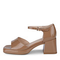 Эффектные кожаные босоножки с глянцевой фактурой. Комфорт стоп обеспечивают кожаная подкладка и стелька из нежной кожи шевро. Пара отлично впишется в образы с брючными костюмами, воздушными платьями и юбками. Широкий каблук высотой 56 мм  формирует оптимальную поддержку и гарантирует устойчивость.