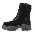 Базовые кожаные ботинки черного цвета. Верх выполнен из мягкого спилка с бархатистой фактурой. Модель утеплена натуральной шерстью. Высокая шнуровка надежно фиксирует обувь на ноге, а застежка на молнию ускоряет процесс надевания пары. Рифленая подошва из резины гарантирует устойчивость на любых покрытиях.
