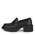 Эффектные черные кожаные лоферы на платформе и устойчивом каблуке. Кожаная подкладка и стелька  обеспечивают комфортную посадку и хороший воздухообмен. Трендовая массивная подошва добавляет устойчивости. Лоферы хорошо дополнят образы с джинсами, брюками, костюмами и платьями.