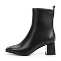 Модельные кожаные ботильоны черного цвета. Эта демисезонная пара на трапециевидном каблуке дополнит классический или романтический образ. Носок острый, он визуально сужает стопу. В верхней части голенища – эластичная резинка, которая хорошо фиксирует лодыжку. Застегивается модель на молнию.