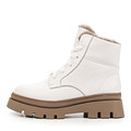 Белые кожаные ботинки на платформе. Высокий прорезиненный рант защищает обувь от воздействия осадков. За комфорт стоп отвечают подкладка и стелька, изготовленные из натуральной шерсти. Высокая подошва из материала ТЭП обеспечивает устойчивость на любых покрытиях. Модель со шнуровкой и удобной застежкой на молнию. Ботинки подойдут для длительных прогулок, посещения офиса, загородного отдыха.