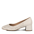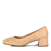 Элегантные бежевые туфли из мягкой кожи шевро. За дополнительный комфорт стоп отвечают кожаная подкладка и перфорированная стелька из шевро. Сквозная перфорация верха обеспечивает идеальный воздухообмен, а широкий каблук высотой 50 мм — отличную устойчивость пары. Кожаные туфли хорошо дополнят образы с платьями, прямыми юбками и брючными костюмами.