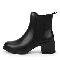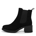 Эффектные черные ботильоны в стиле челси. Верх выполнен из бархатистого велюра. Подкладка и стелька изготовлены из мягкого ворсина. Высокая подошва и каблук выполнены из легкого и прочного материала ТЭП. Модель дополнена эластичными вставками для надежной фиксации обуви на ноге и практичной петлей, ускоряющей процесс надевания пары. Благодаря лаконичному дизайну, ботильоны отлично дополнят образы с укороченными брюками, джинсами и платьями.