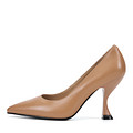 Базовые темно-бежевые кожаные туфли на фигурном каблуке. Подкладка и стелька из мягкой натуральной кожи формируют комфортную посадку. Каблук высотой 95 мм гарантирует оптимальное распределение нагрузки по стопе. Туфли идеально дополнят образы с джинсами, юбками, платьями.