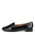 Акцентные лоферы чёрного цвета из лакированной кожи. Комфорт стоп обеспечивают мягкая текстильная подкладка и стелька, выполненная из кожи шефро. Гибкая резиновая подошва гарантирует надежное сцепление с поверхностью. Пара идеально впишется в повседневные образы на теплый сезон.