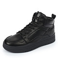 Высокие кеды черного цвета. О комфорте стоп в любую погоду заботятся подкладка и стелька, выполненные из мягкого ворсина. Высокая подошва из качественной резины гарантирует отличное сцепление с поверхностью. Кожаные кеды дополнены удобной петлей, ускоряющей процесс надевания обуви. Моель с практичной шнуровкой, прочно фиксирующей обувь на ноге.