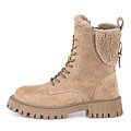 Стильные бежевые ботинки из мягкого ворсистого спилка со вставками из натурального меха. Комфорт стоп в любую погоду гарантируют подкладка и стелька из натуральной шерсти. Модель со шнуровкой и застежкой на молнию. Гибкая и прочная резиновая подошва отвечает за надежное сцепление и долгий срок службы. Высокие трендовые ботинки подойдут как для прогулок и активного отдыха, так и для офисных образов.
