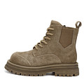 Актуальные бежевые ботинки с высокой шнуровкой. Верх выполнен из прочного спилка с бархатистой фактурой. Шерстяные подкладка и стелька поддерживают комфортную температуру внутри обуви на улице и в помещении. Высокая резиновая подошва с глубоким рисунком протектора отличается прочностью и хорошим сцеплением с поверхностью.