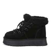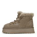 Базовые бежевые угги с функциональной шнуровкой и декором из натурального меха. Материал верха - прочный спилок с бархатистой фактурой. Стелька из мягкой натуральной шерсти поддерживает комфортную температуру внутри пары. Высокая подошва из ТЭП с выраженными протекторами отличается легкостью, морозоустойчивостью и хорошим сцеплением с поверхностью.