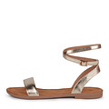 Женские летние сандалии из экокожи с низким каблуком и тонкой подошвой идеально подходят для жаркой погоды. Эти сандалии с ремешком вокруг щиколотки и круглым носом предназначены для повседневной носки и отдыха, города и дачи. Подходят для женщин, девушек и подростков. Золотистые сандалии с коричневой подошвой и качественной фурнитурой, легкие и удобные, с отличной гибкой подошвой. Комфортны для узкой и средней полноты ног.