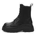 Лаконичные черные ботинки из матовой кожи из спилка. Подкладка и стелька утеплены натуральной шерстью для оптимальной терморегуляции. Массивная подошва из материала ТЭП с выраженными протекторами отличается легкостью, морозоустойчивостью и хорошим сцеплением с любой поверхностью. Модель фиксируется шнурками и удобно застегивается на молнию.