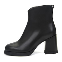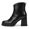 Графичные черные ботильоны на холодный сезон. Материал верха - мягкая кожа из спилка с тиснением под крокодила. Подкладка и стелька утеплены натуральной шерстью, которая поддерживает комфортную температуру внутри обуви на морозе и в помещении. Утолщенная резиновая подошва отличается прочностью и устойчивостью. Блочный каблук высотой 8 см грамотно распределяет нагрузку на стопы.